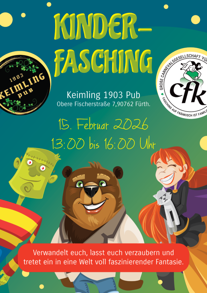 Am Sonntag, den 15. Februar 2026, lädt die Große Carnevalsgesellschaft „Fürther Kleeblatt“ 1912 e.V. zum Kinderfasching nach Fürth ein. Die Veranstaltung findet von 13:00 bis 16:00 Uhr im Keimling 1903 Pub, Obere Fischerstraße 7, 90762 Fürth, statt.